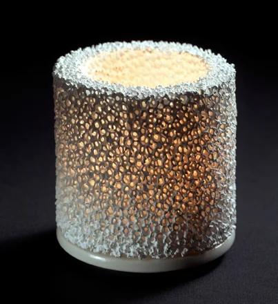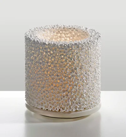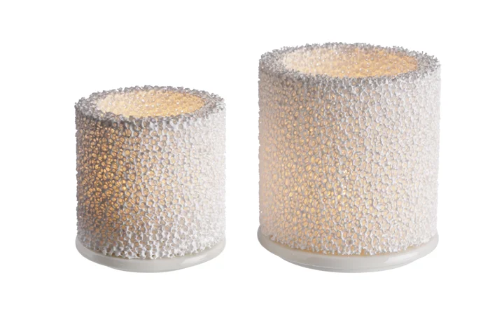 The votive is produced of porous, coral like ceramic material. With a tea light in it, the material creates an atmosphere that reminds of an icy candle lantern in snowy winter time.